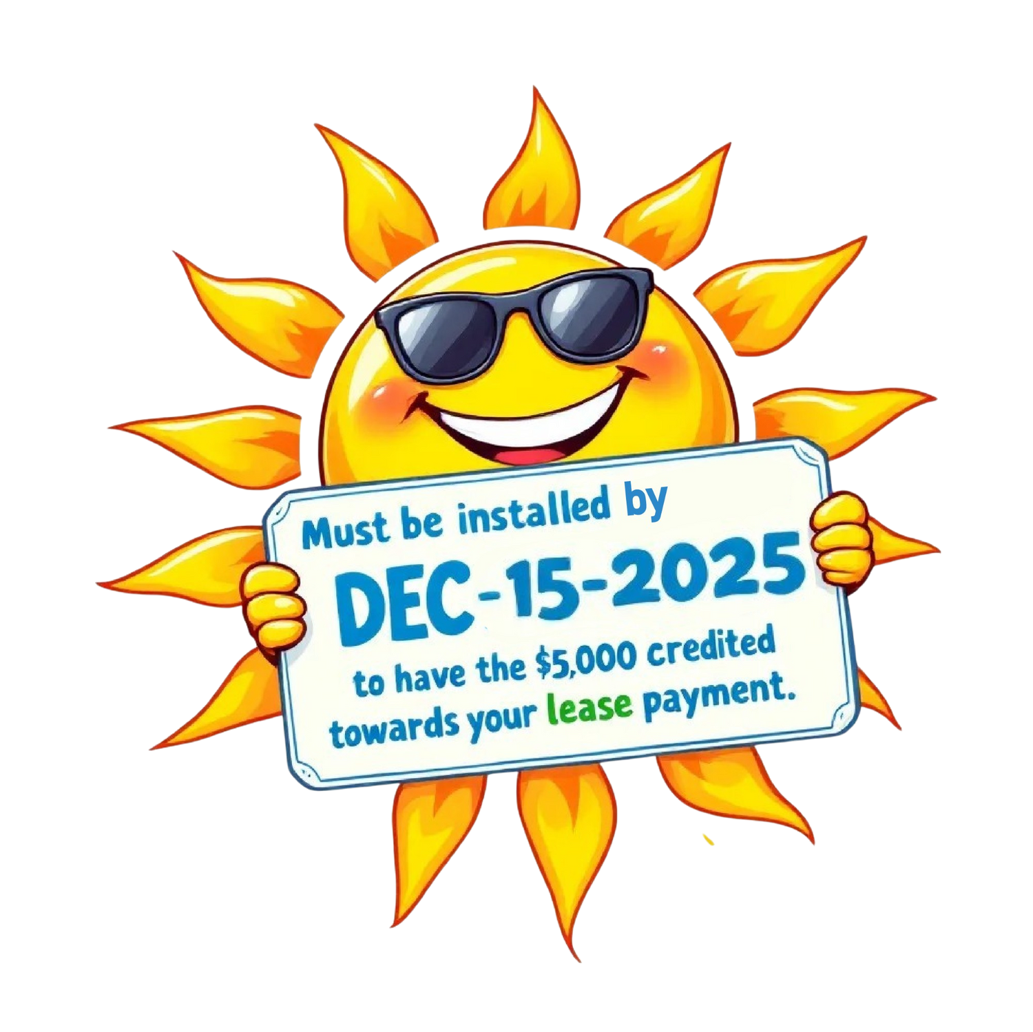 System has to be installed by Dec 15th 2025, to have the 5,000 credited towards your lease payments.